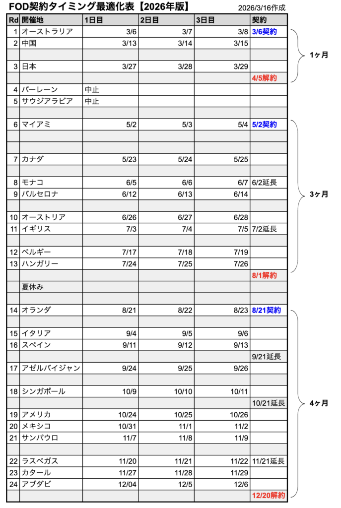 2026年シーズンのレース日程をもとに、FODの契約タイミングを整理すると次のようになります。